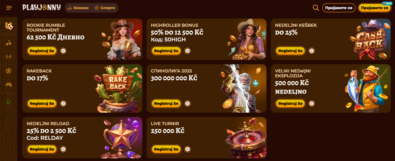 PlayJonny bonus i PlayJonny promocije su stalni deo ponude, osmišljene da nagrade i nove i postojeće igrače. Od atraktivnog bonusa dobrodošlice koji u startu uvećava vašu šansu za dobitak, do redovnih nedeljnih ili mesečnih promocija. Česte su i cashback ponude koje vam vraćaju deo uloženog novca. Osim toga, organizuju se i turniri u slotovima sa impresivnim nagradnim fondovima. PlayJonny promocije se redovno menjaju, pa je preporuka da uvek proverite sekciju “Promocije” kako ne biste propustili sjajne prilike za dodatne dobitke.